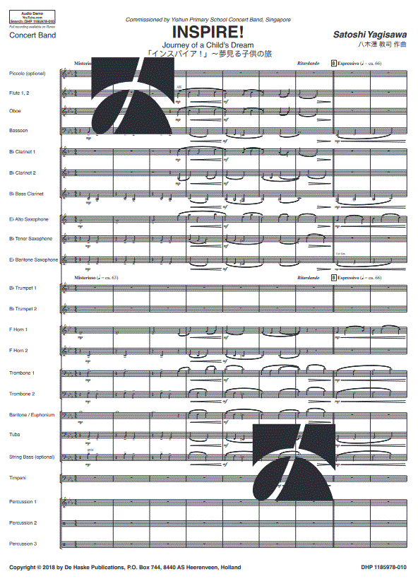 Informations complémentaires/contenu Le compositeur Satoshi Yagisawa est très apprécié en Asie, et tout particulièrement à Singapour. Il a composé ce morceau en 2017 en tant que commande pour le Yishun Primary School Concert Band de Singapour, où le compositeur jouit d'une grande renommée. Le titre Inspire ! est issu des initiales des noms des salles de classe de l'école : Independence, Nation Loving, Sincerity, Perseverance, Integrity, Respect et Excellence. Le morceau dégage une atmosphère positive et une foi en l'avenir pour la jeune génération à venir.