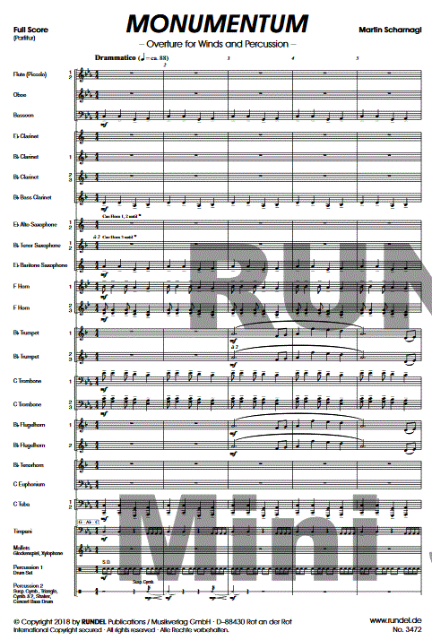 Informations complémentaires/contenu Le terme latin « monumentum » désigne en musique des œuvres d'une importance artistique durable, qui impressionnent par leur rigueur formelle ou leur expression symbolique. L'ouverture « Monumentum » pour orchestre d'harmonie de Martin Scharnagl captive par ses contrastes saisissants : un « Drammatico » en mi bémol majeur cède la place à un « Allegro » virtuose en ré bémol majeur, avant qu'un retour cyclique ne vienne achever la structure. La richesse de l'instrumentation et les changements de tempo dynamiques exigent une grande maîtrise technique et une forte expressivité. Le titre souligne le caractère monumental de l'œuvre – un hommage à la tradition de l'orchestre d'harmonie enrichi par des techniques de composition modernes.