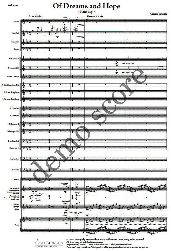 Informations complémentaires/contenu La composition de Simbeni, « Of Dreams and Hopes » (2019), pour orchestre à vent, explore les thèmes du rêve et de l’espoir à travers deux motifs contrastés : un thème choral méditatif représente le rêve, tandis qu’un thème vivace dynamique représente l’espoir. La structure en cinq parties développe ces thèmes par contrastes, réinterprétations et une synthèse finale dans la coda. Simbeni démontre comment des émotions abstraites peuvent être rendues audibles par la construction musicale – notamment par le tempo, l’harmonie et la forme. La coda unit les deux thèmes, symbolisant l’unité du rêve et de l’espoir.