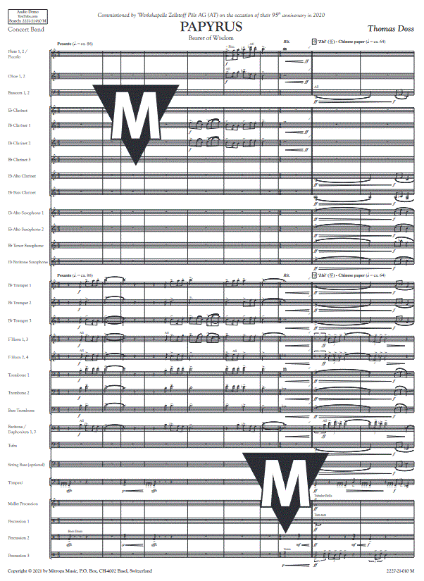 Informations complémentaires/contenu Le papyrus, support d'écriture ancestral fabriqué à partir de la plante du même nom, a joué un rôle essentiel dans la préservation du savoir en Égypte antique et dans le monde méditerranéen. Le compositeur autrichien Thomas Doss explore musicalement l'histoire du papyrus dans sa composition « Papyrus (Porteur de sagesse) » pour orchestre d'harmonie. L'œuvre mêle sonorités anciennes et éléments modernes et dépeint différentes époques, de l'Antiquité au Moyen Âge jusqu'à nos jours. Elle est particulièrement adaptée aux concerts à vocation historique ou pédagogique.