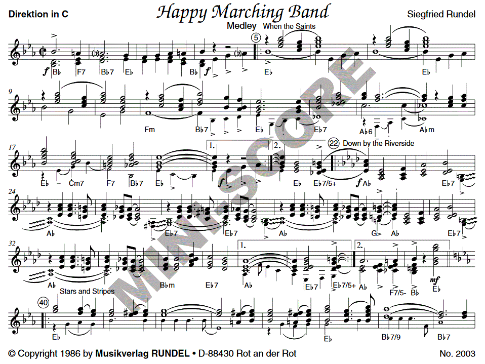Happy Marching Band von Siegfried Rundel ist eine stimmungsvolle Zusammenstellung beliebter amerikanischer Folk Songs im praktischen Marschformat. Mittlerweile gehört das Stück zum Standardrepertoire vieler Blasorchester und ist fester Bestandteil einer jeder Stimmungsmappe. Einfach, unkompliziert und sofort spielbar!
