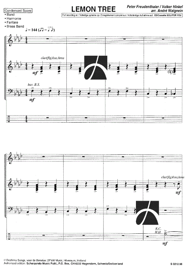 Lemon Tree - cliquer ici Lemon Tree (orchestre d'harmonie; ou; orchestre de fanfare), Score condensé et parties 99,99